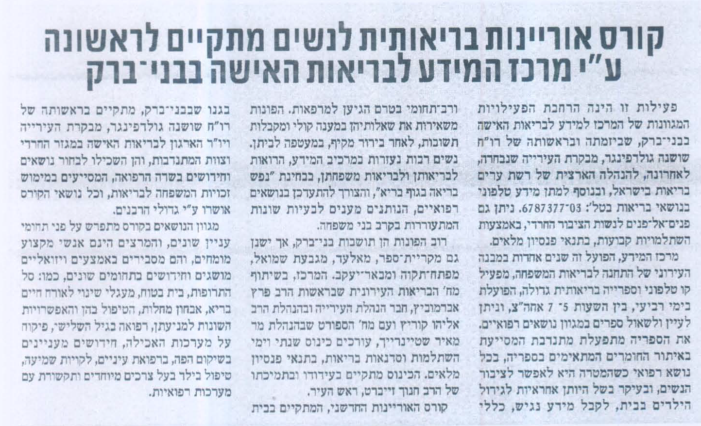 שעה טובה מדווח על קורס אוריינות בריאותית המתקיים על ידי מרכז המידע לבריאות האשה: